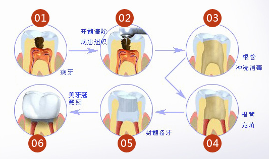 根管预备、根管消毒和根管充填。根据牙齿炎症严重程度、治疗的难度等因素的影响,一般需要分2-4次进行,目的是达到透彻消毒灭菌,保障疗效,每次间隔1周左右。