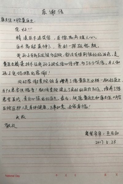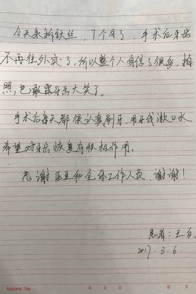 迄今为止,康贝佳口腔已经帮助无数牙齿缺失、牙齿不齐等患者重新塑造了美丽,他们纷纷给康贝佳送来了感谢信和锦旗,述说真实的感受以及对康贝佳的评价。特别是种植科的吴高谊博士、谭学举医生,正畸科的董泰巍医生,受到了一致好评。现特将部分感谢信在大连康贝佳口腔的官网公开(为保护个人隐私,感谢信的署名将不显示),让更多的求美者可以体会到真实的感受,以供选择和参考。