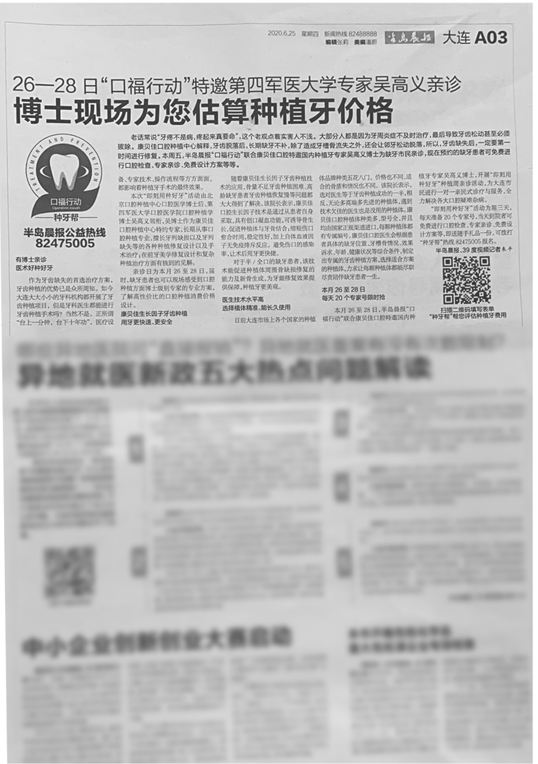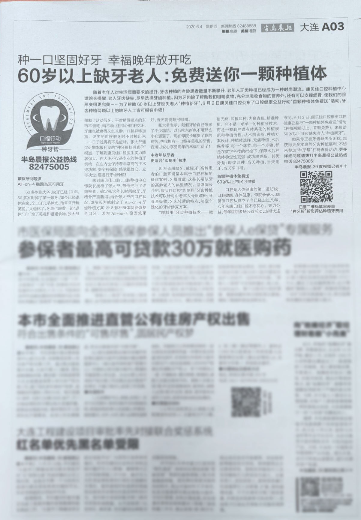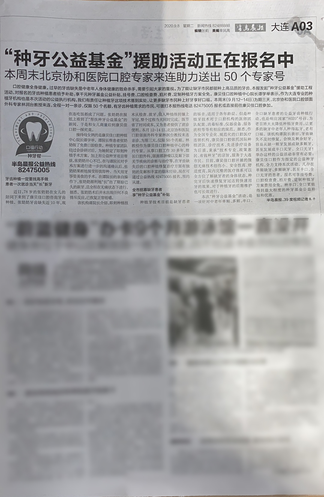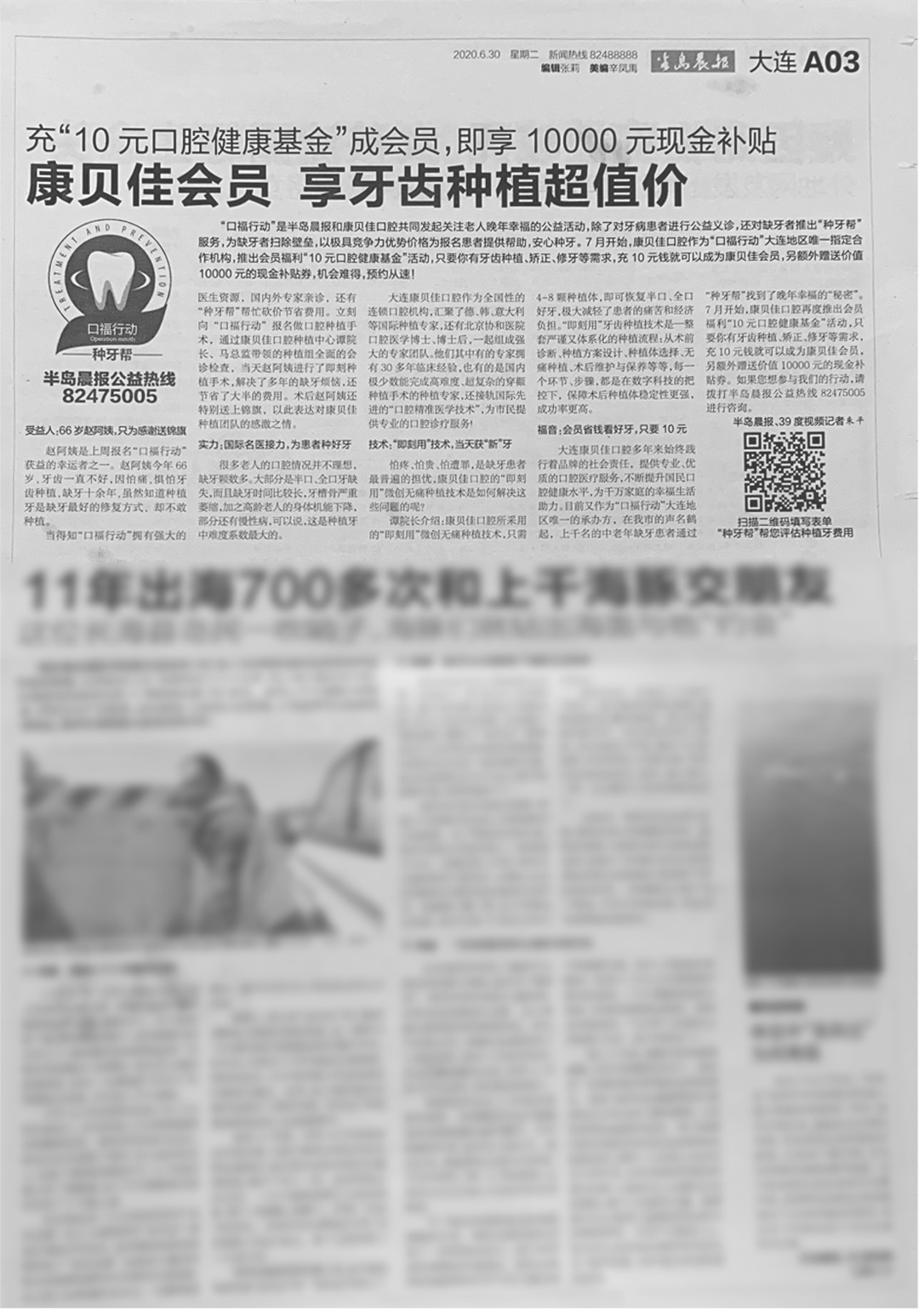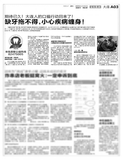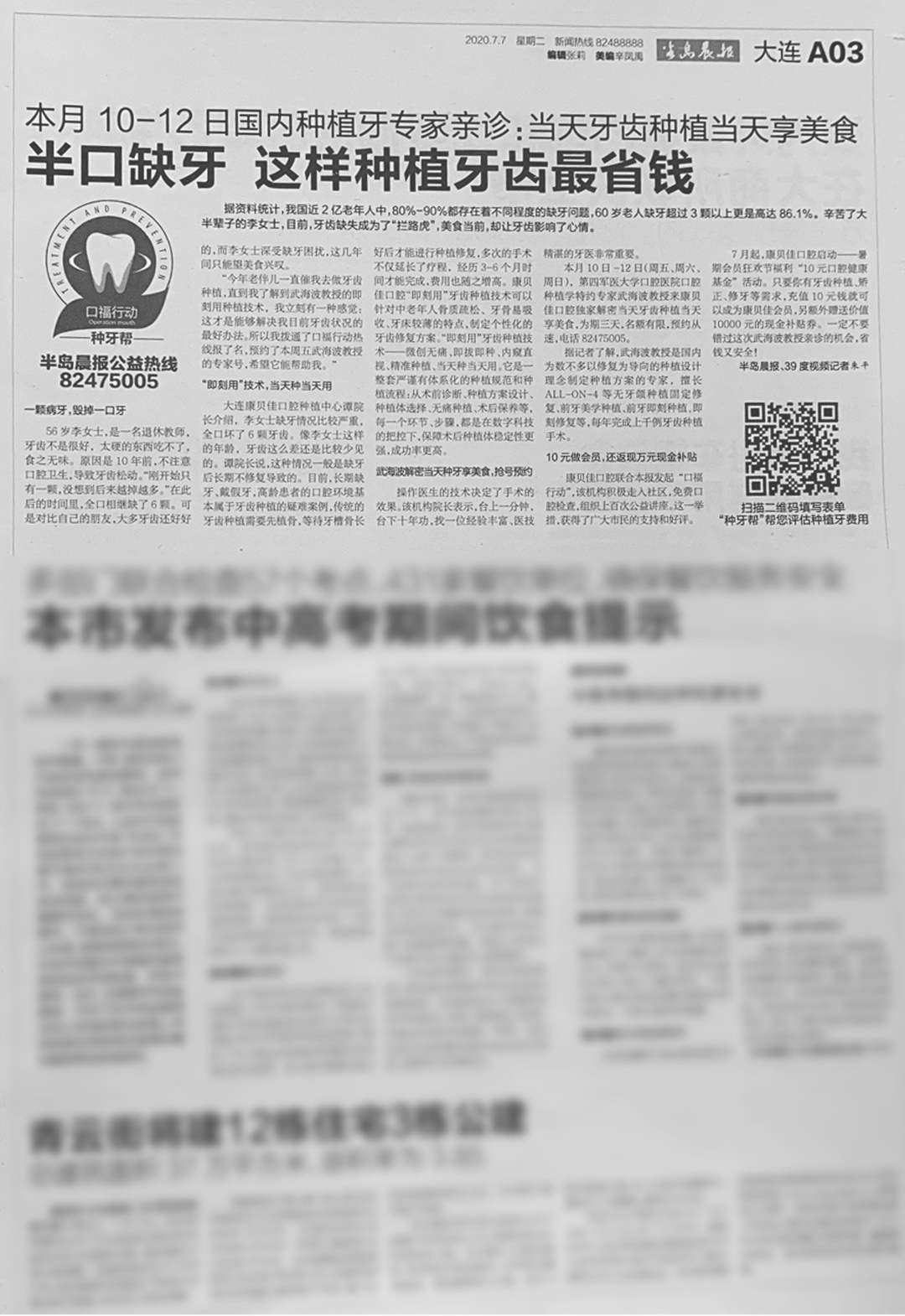 中国有句俗语:牙疼不是病。老一辈人整日为生计奔波,小病扛着大病推着,牙疼这种小问题根本不会去看医生,坏一两颗牙根本不放在心上。有数据显示,在全国35-40岁的人群中,平均失牙数达到2-2.5颗;65-74岁老人平均失牙数9.86颗;80岁以后,近三分之一的老人嘴里没有一颗牙。由半岛晨报联合康贝佳口腔共同发起的“口福行动2019”,就是要呼吁大众关注口腔健康,关心儿童口腔,让其无忧成长;关怀成年人口腔,帮其预防疾病;关爱缺牙老人,提高其生活质量。半岛晨报作为宣传媒介,康贝佳口腔作为唯一技术支持单位,集社会关爱与责任为一体,都在尽自己的微薄力量,推动口腔健康传递公益理念,尽力实现世界卫生组织提倡的“8020”计划。