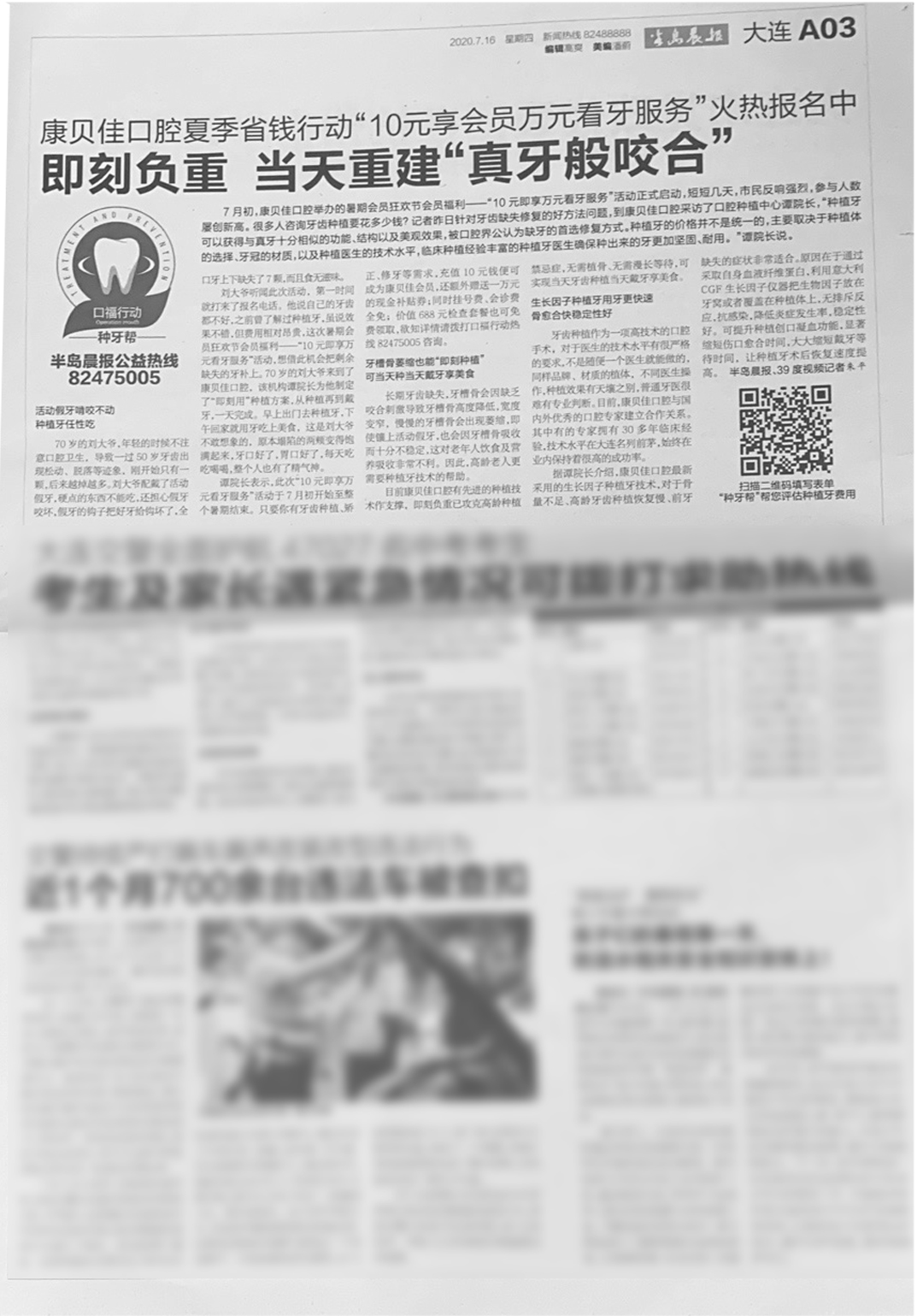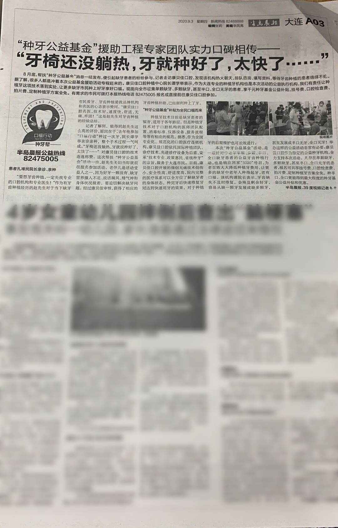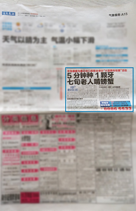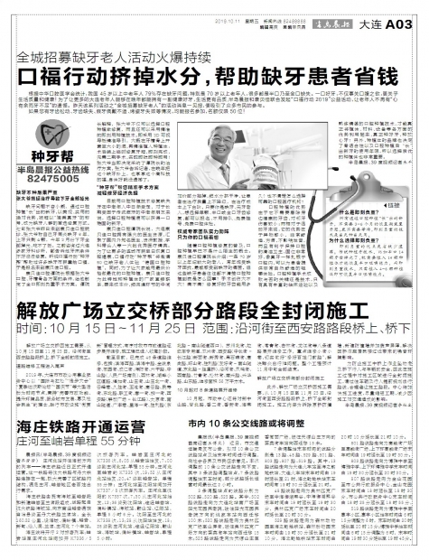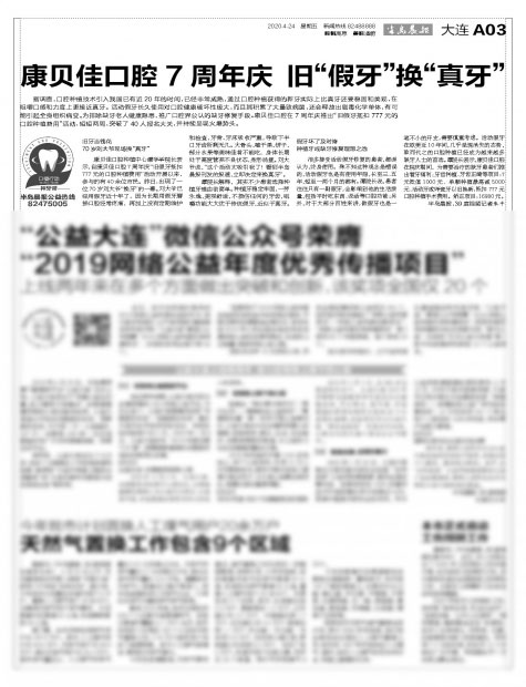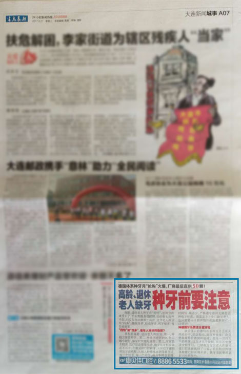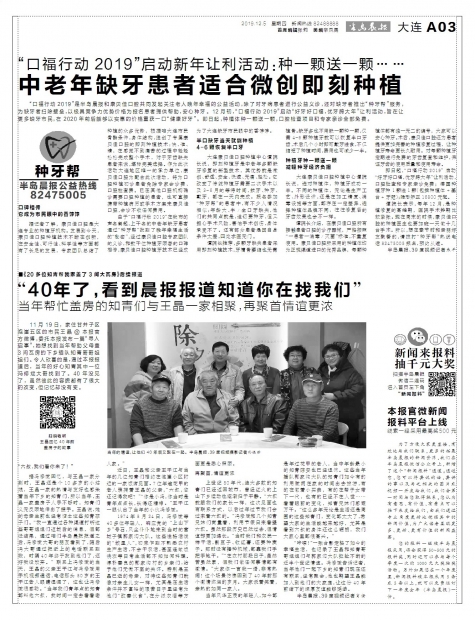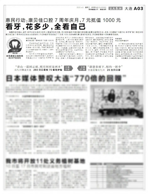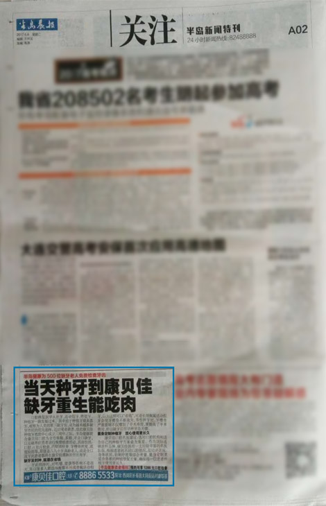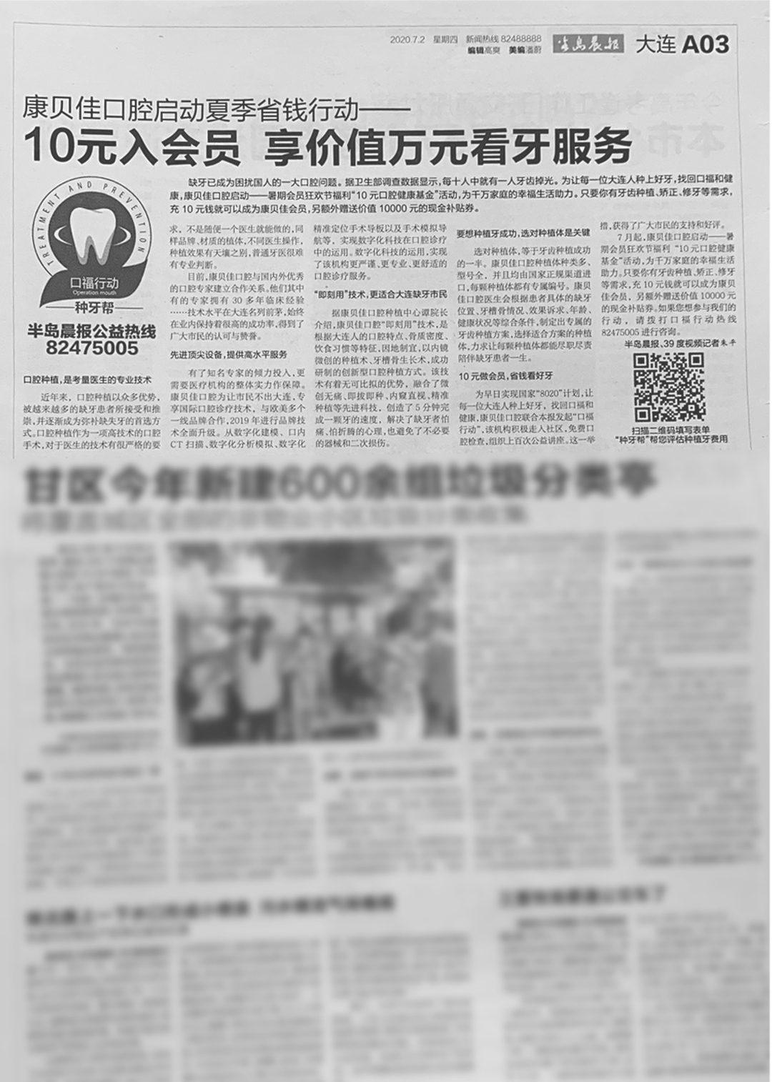 中国有句俗语:牙疼不是病。老一辈人整日为生计奔波,小病扛着大病推着,牙疼这种小问题根本不会去看医生,坏一两颗牙根本不放在心上。有数据显示,在全国35-40岁的人群中,平均失牙数达到2-2.5颗;65-74岁老人平均失牙数9.86颗;80岁以后,近三分之一的老人嘴里没有一颗牙。由半岛晨报联合康贝佳口腔共同发起的“口福行动2019”,就是要呼吁大众关注口腔健康,关心儿童口腔,让其无忧成长;关怀成年人口腔,帮其预防疾病;关爱缺牙老人,提高其生活质量。半岛晨报作为宣传媒介,康贝佳口腔作为唯一技术支持单位,集社会关爱与责任为一体,都在尽自己的微薄力量,推动口腔健康传递公益理念,尽力实现世界卫生组织提倡的“8020”计划。