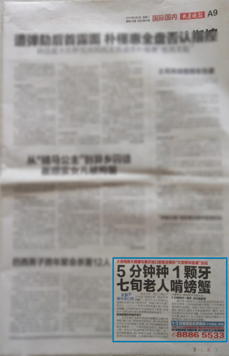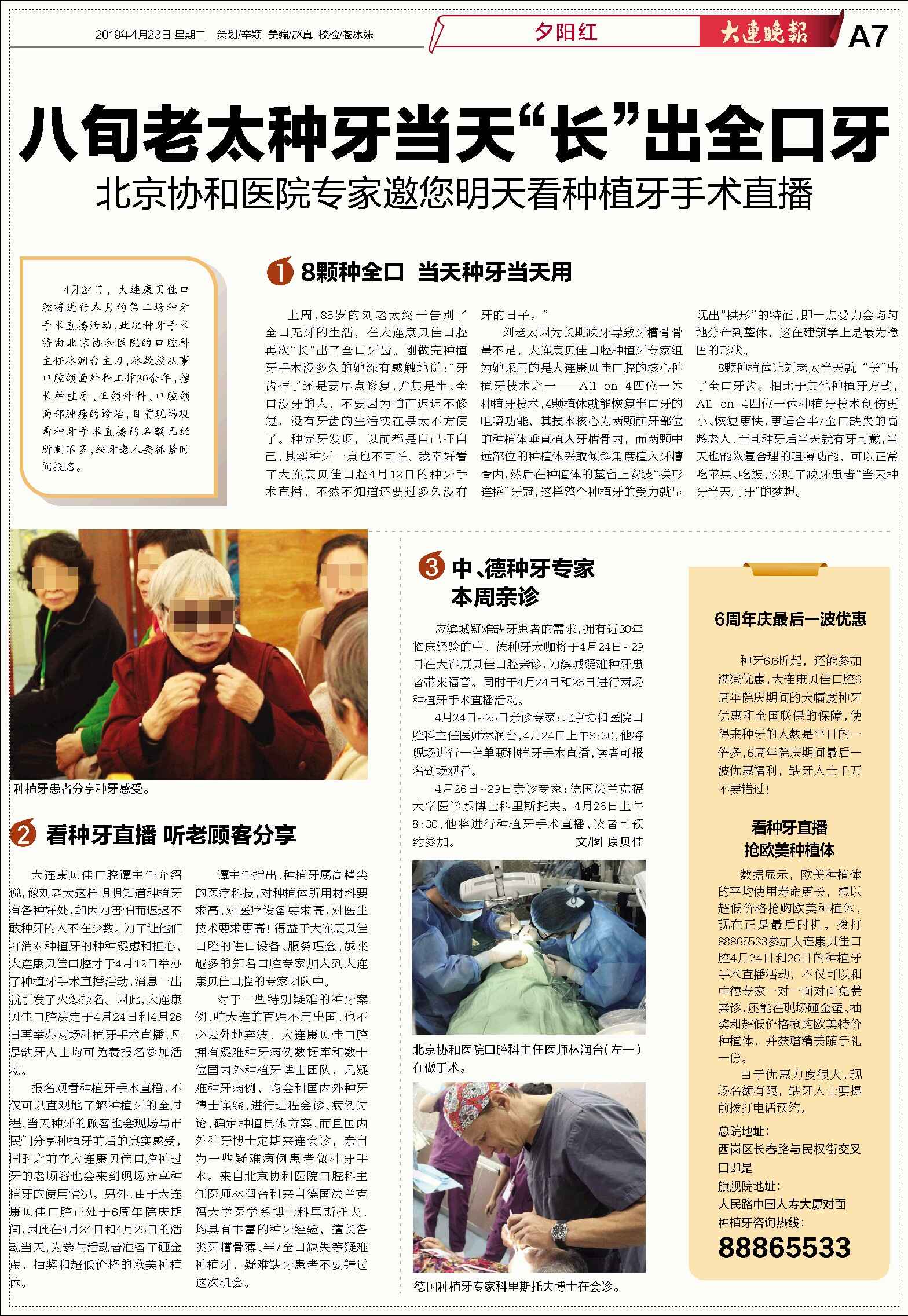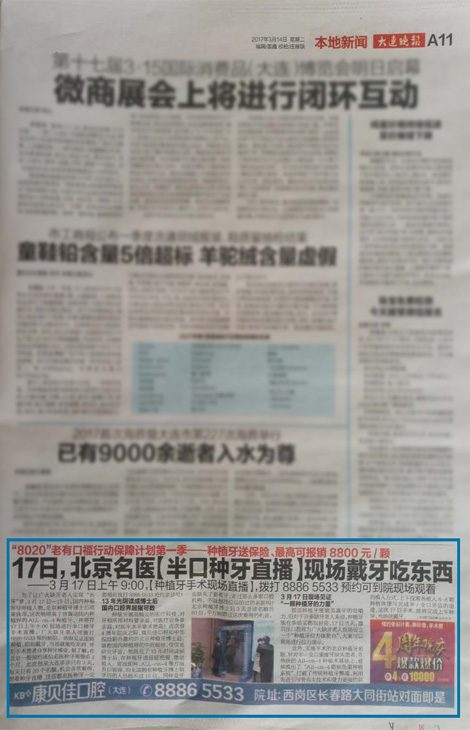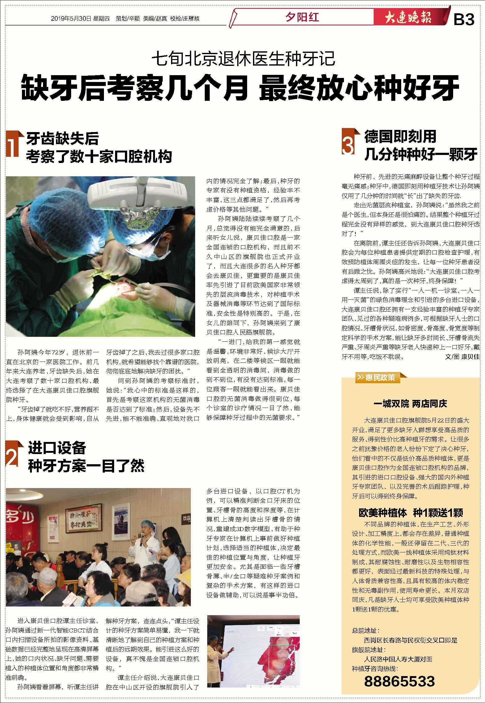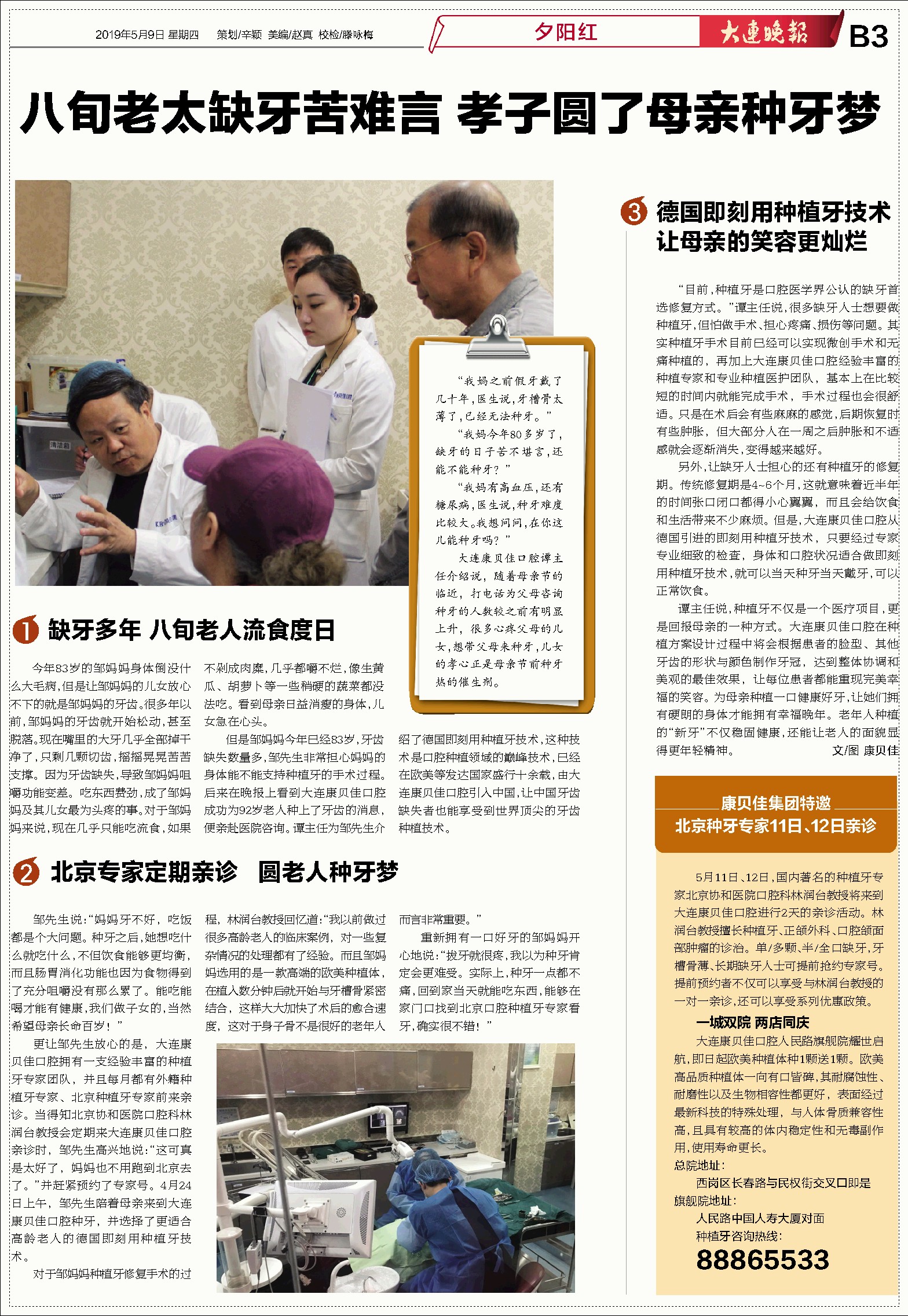听说种植牙和真牙一样好用,便萌生了种牙的心思,可是去口腔机构一打听,却由于缺牙时间太长,种植难度大,被多家口腔机构拒绝,后来从晚报上看到大连康贝佳口腔是全国连锁口腔机构,并成功为其他90多岁的老人种上了牙齿,还有国内外的种牙博士前来亲诊,便拨打了预约热线0411-83790161,想试试自己在这里能不能种上牙。