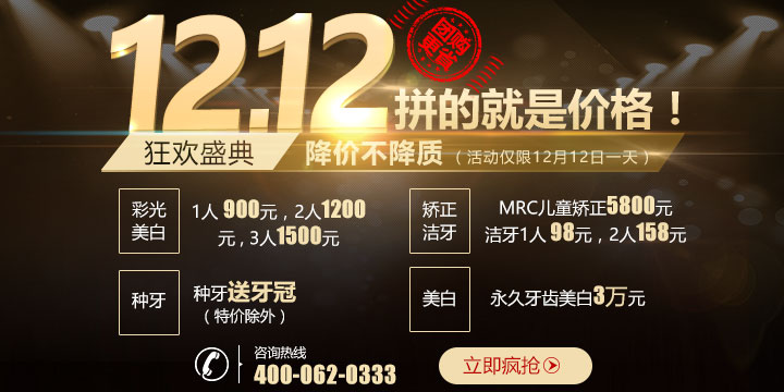 “11.11”已经过去,“12.12”还可以继续狂欢。康贝佳口腔特推出了“双12美牙钜惠·拼的就是价格”活动。凡网络预约在12月12日当天做牙齿种植、牙齿美容等项目,均可享受康贝佳美牙狂欢盛典。团购洗牙、牙齿美白,优惠力度更大。双十一为自己无限制的购物,双十二该做点有意义的事情。