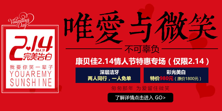 情人节到啦!礼物准备好了吗?是不是还是那几样?巧克力?玫瑰花?low~俗~那要送什么好呢?趁着情人节不妨送自己和爱人一口整齐洁白的美齿,健康的牙齿拥有更优秀的微笑,创意、美丽、低价、健康……让你度过一个浪漫的情人节,康贝佳口腔情人节美牙特惠开始啦!!!