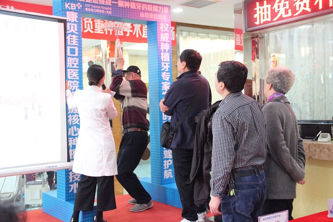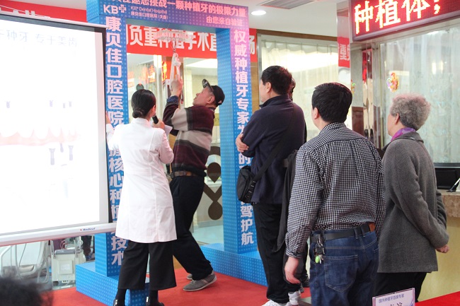 很多人都担心种上的牙齿究竟结不结实、牢固不牢固?今天在现场的种植牙拉力体验台,其中一位85.3公斤的顾客,牟足了劲往下拉,上面的种植牙是纹丝不动,足以说明种植牙的牢固程度。