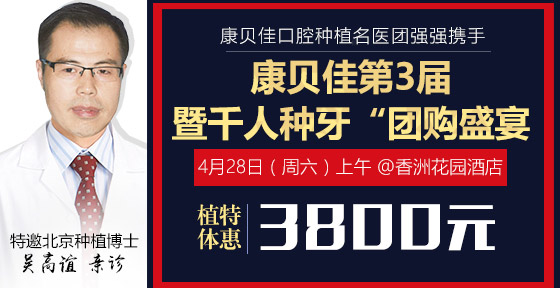康贝佳千人团购盛宴,招募千人团,看牙便可以享受诸多优惠,还可以与北京种植博士吴高谊面对面约诊,享受先进种植体系和专业的技术。重塑口腔健康,原来也可以这么省钱、省心。我要参团》》》》
