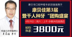 今年是大连康贝佳口腔成立五周年,为感谢滨城百信的支持,特在4月28日院庆日举办第3届暨千人种牙团购盛宴。届时,各大种植体厂商也会来到现场,主流种植体厂商价让利给广大百姓,用更……【详细】